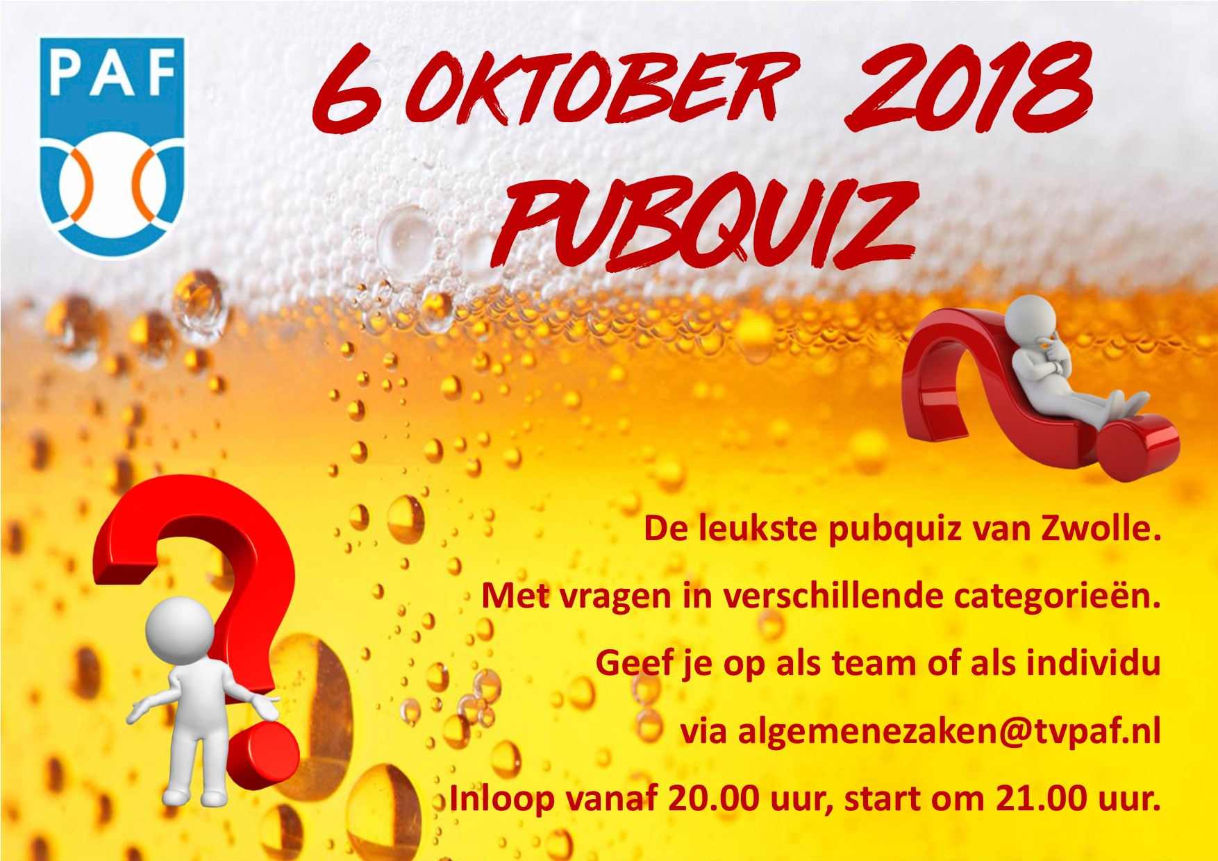 Op zaterdag 6 oktober a.s. willen wij een PUB Quiz organiseren, waarbij mooie prijzen te winnen zijn. Deze Pub quiz is bedoeld voor onze leden, maar aanhang (partners en vrienden van onze leden) zijn ook welkom. Inmiddels zijn de eerste aanmeldingen binnen, maar nog niet voldoende. Gelet op het feit dat wij die avond ook wat artiesten willen laten optreden en de nodige voorbereidingen moeten worden getroffen, willen wij iedereen vragen die mee wil doen om zich op te geven voor uiterlijk dinsdag 25 september a.s. Opgeven kan als individu of als team (5 tot 6 spelers) via algemenezaken@tvpaf.nl. Hier kunt u ook terecht voor eventuele vragen. Het event vindt alleen doorgang bij voldoende deelname, dus geef u snel op.