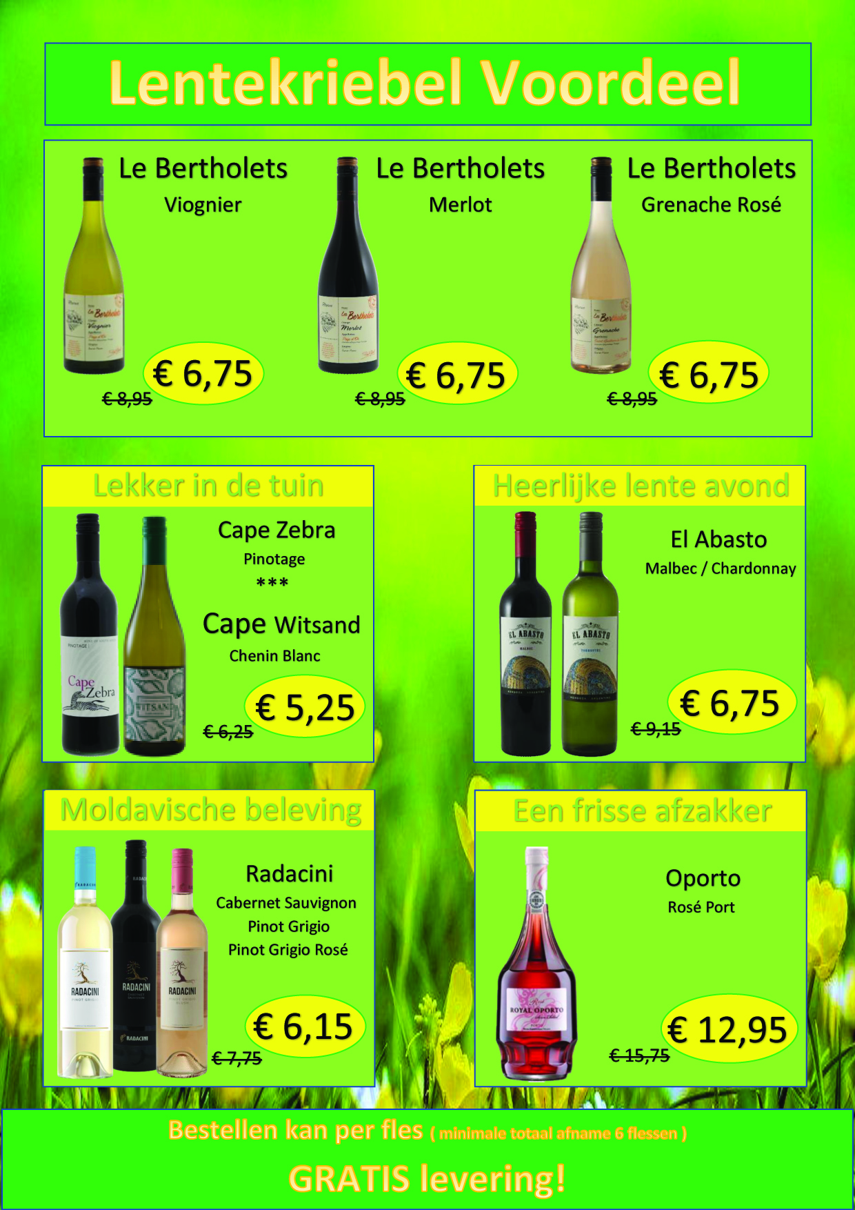 Geef nu je bestelling door via info@wijnwereldnederland.nl. Hopend op beetje steun van jullie voor onze sponsors en dat jullie kunnen genieten, in goede gezondheid, van een lekker glas kwaliteitswijn.