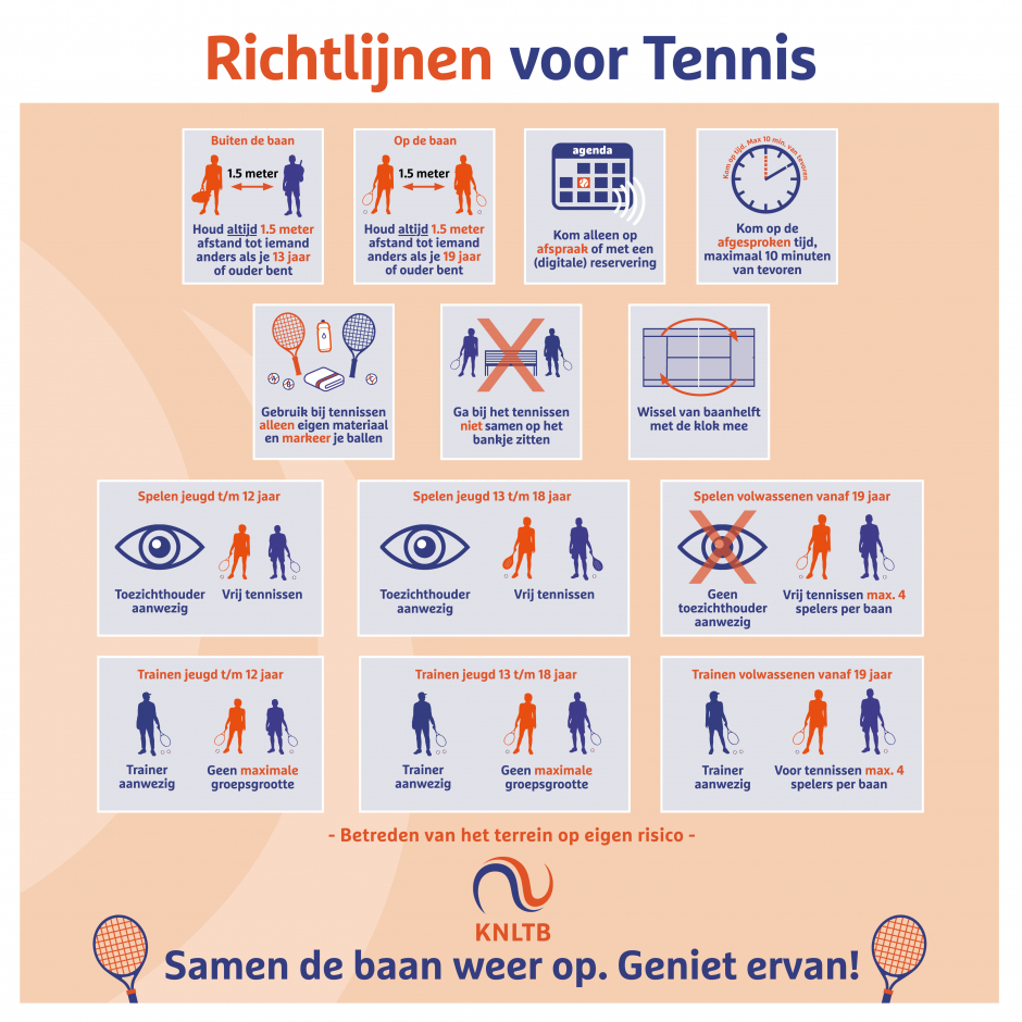 - Verruiming (onbeperkt maar wel met verplichte reservering) speelmogelijkheden voor leden door-de-week (maandag t/m donderdag) overdag (tot 18:15 of 18:30 uur afhankelijk van het baanblok) en in het weekend (vrijdag t/m zondag)