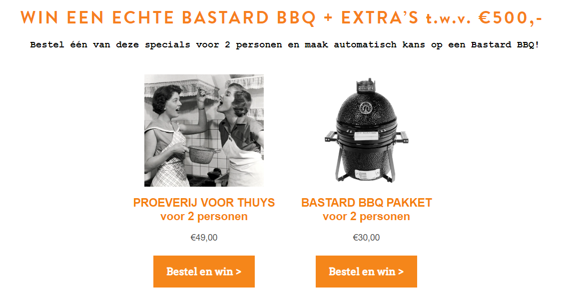 Ook heeft het Weeshuys een mooie winactie in de webshop: je kunt een Bastard BBQ winnen! En wat dacht je van een proeverij voor 2 personen en BBQ pakketten voor Thuys. Kortom, alles wat je nodig hebt om er thuis of op de club een feestje van te maken!